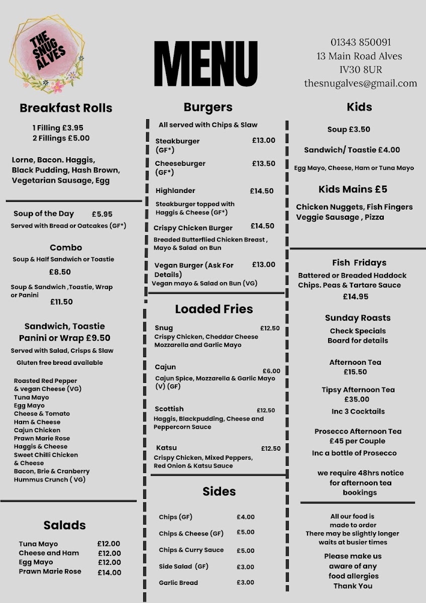 Welcome to The Snug (Alves) Limited, a charming café nestled in Alves, Elgin. The menu offers a delightful selection, perfect for any palate. Guests can indulge in mouthwatering loaded fries, with options like the hearty Snug and savory Katsu. For lighter fare, their salads, such as Tuna Mayo and Prawn Marie Rose, add a fresh twist.